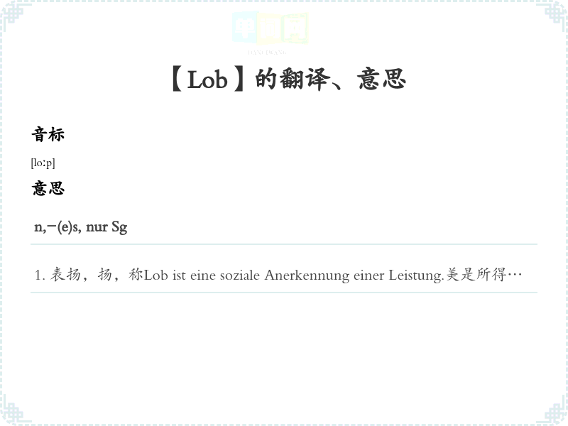 表扬,扬,称Lob ist eine soziale Anerkennung einer Leistung.美是所得成就的社会认可。Lob und Kritik褒贬 Fr helper cop yright