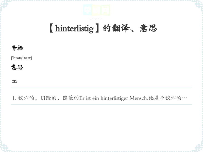 狡诈的,阴险的,隐蔽的Er ist ein hinterlistiger Mensch.他是个狡诈的人。Diese hinterlistigen Tricks dürfen nicht angewendet werden.这些阴险的把戏是不被允许的。Seine hinterlistigen Pläne wurden entdeckt.他的阴险计划被揭穿了。