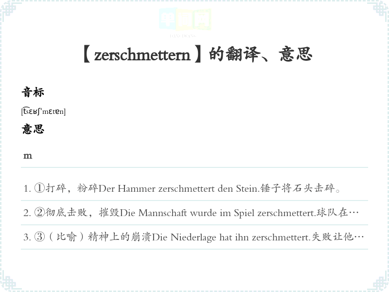 ①打碎,粉碎Der Hammer zerschmettert den Stein.锤子将石头击碎。
