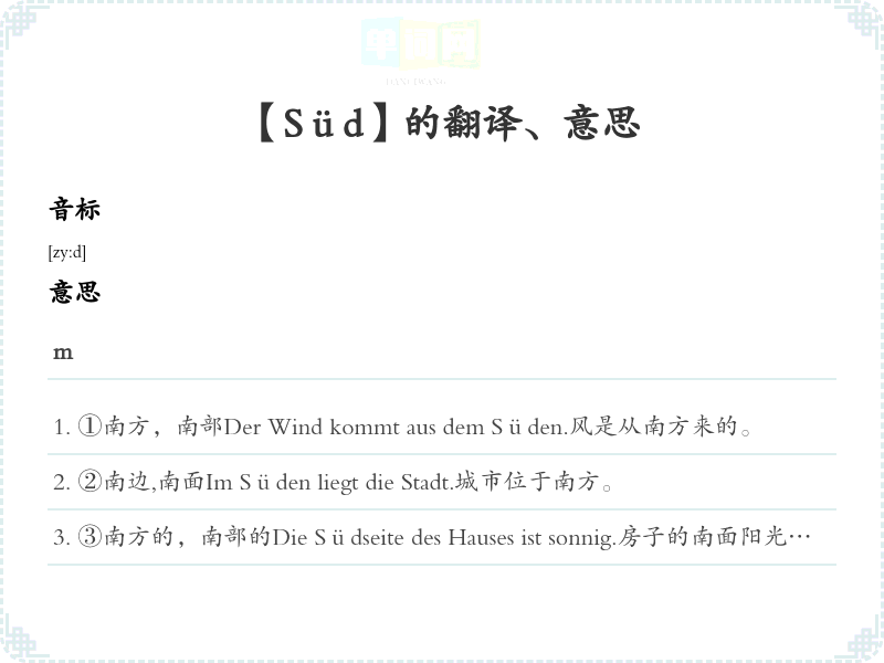 ①南方,南部Der Wind kommt aus dem Süden.风是从南方来的。