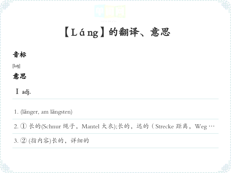 ③ [口]在沿,在上Hunderte von Menschen hatten sich an der Straße lang aufgestellt. 几百站立在路。Ⅲ Präp<支配第四格,置于名词之后>[口]沿着,顺着支配第四格,置于名词之后>den Fluss lang gehen 沿着河岸走