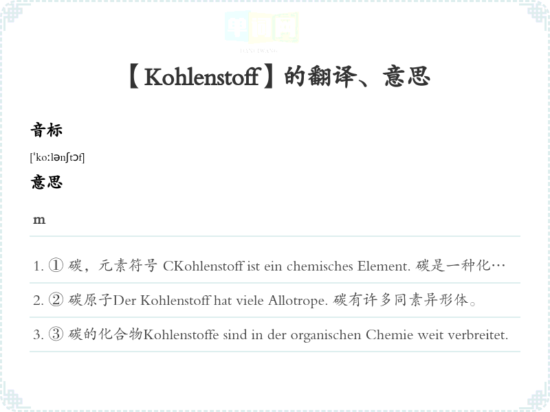 ① 碳,元素符号 CKohlenstoff ist ein chemisches Element. 碳是一种化学元素。