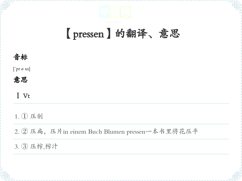 ⑤ 强迫,迫使etw. in ein Schema / System pressen把...硬塞到一框框里面的(一,体的)Ⅱ Vi屏气使,用力挤压Bei der Geburt muss die Mutter kräftig pressen.母亲时必须屏气使。语法搭配sich+四格, +四格, in+四格, auf+四格, gegen+四格, an+四格, aus+三格