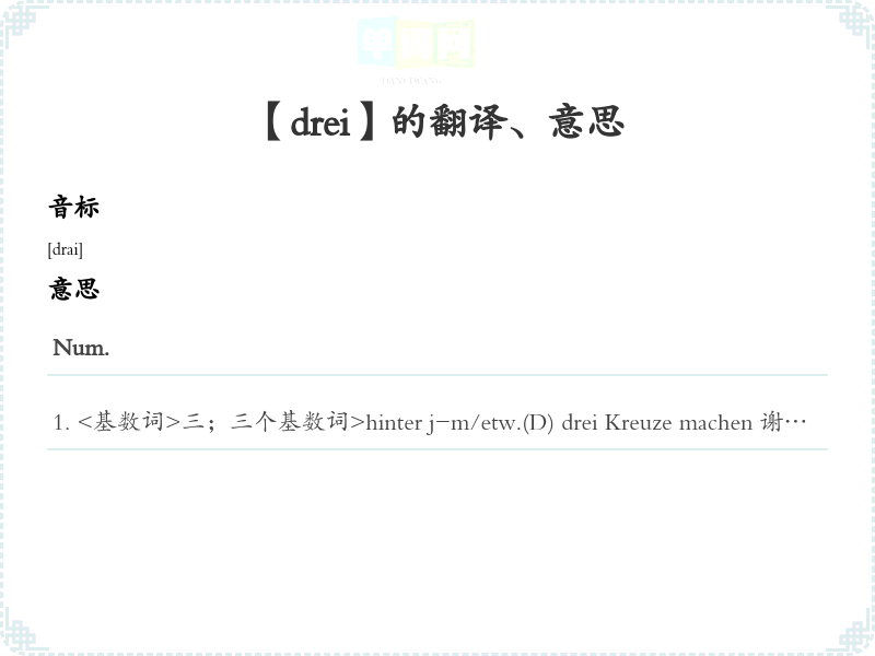 <基数词>三;三个基数词>hinter j-m/etw.(D) drei Kreuze machen 谢天谢地,总算事打发掉了Wir haben keine dreie Worte miteinander gewechselt. 我们互相没说过几句话。(彼此不熟悉)Ich will es in/mit drei Worten erklären. 我想用两三句话简短解释一下。Aller guten Dinge sind drei. [谚]好事成三。Ehe man bis drei zählen konnte, war er wieder da. 他一转眼又回来了。Er arbeitet für drei. 他工作一个顶三。