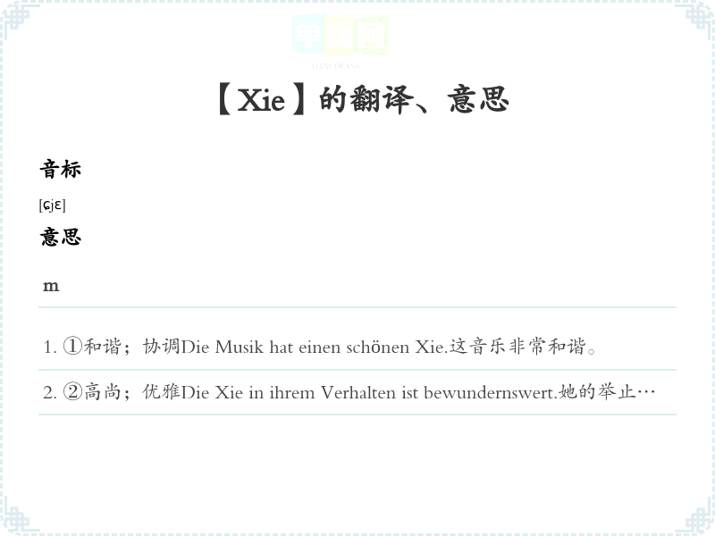 ①和谐;协调Die Musik hat einen schönen Xie.这音乐非常和谐。