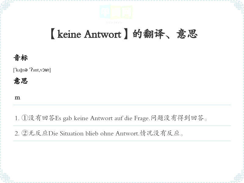 ①没有回答Es gab keine Antwort auf die Frage.问题没有得到回答。