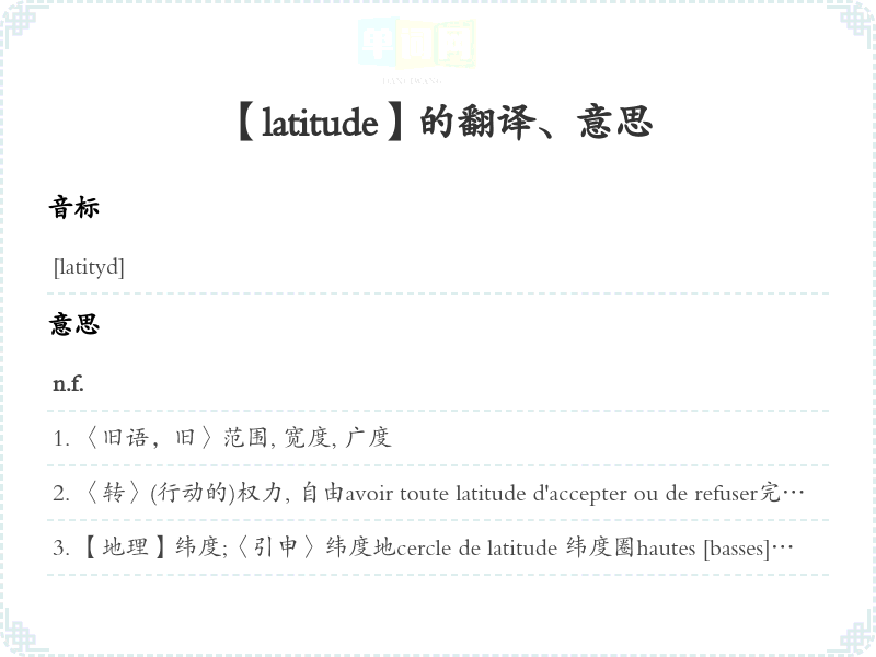 〈转〉(行动的)权力, 自由avoir toute latitude d'accepter ou de refuser完全有接受或拒绝的自由donner toute latitude à qn pour faire qch.给某人去办某事的一切行动自由
