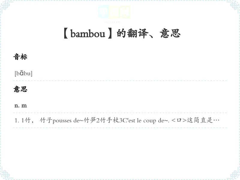 1竹, 竹子pousses de~竹笋2竹手杖3C'est le coup de~. <口>这简直是敲竹杠。 口>