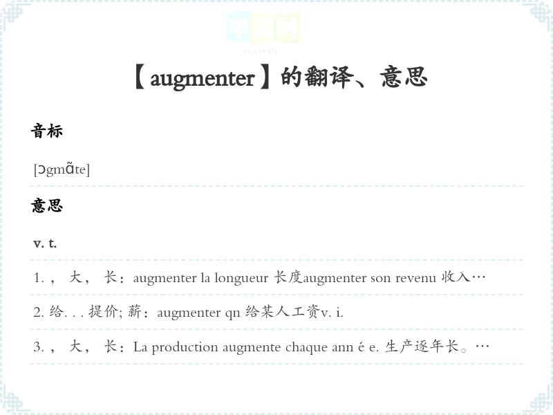 【augmenter】 助记:、 词根:、 派生:、 用法:、 名词变:、 近义词:、 反义词: 联想词