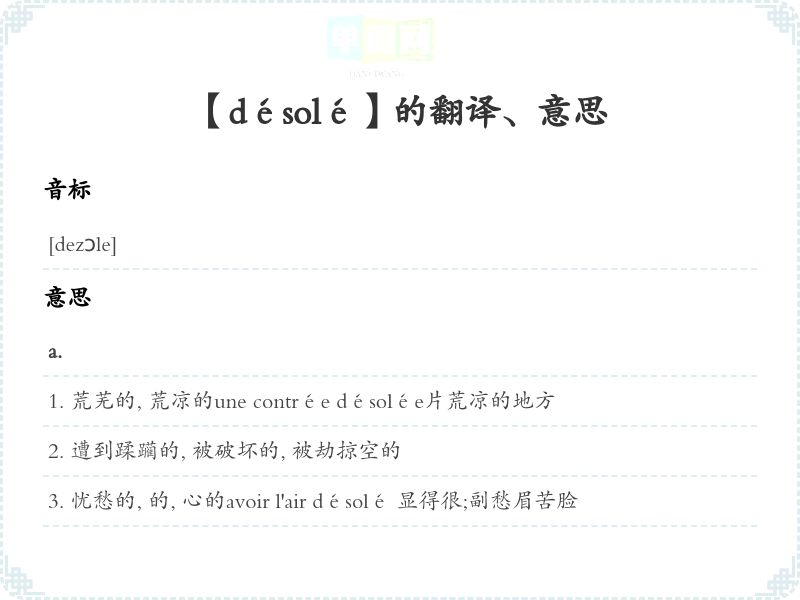 忧愁的, 的, 心的avoir l'air désolé 显得很;副愁眉苦脸