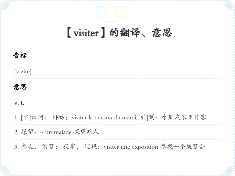 【visiter】 派生:、 近义词:、 义词: 联想词