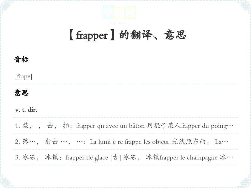 敲, , 击, 拍:frapper (à la porte) 敲门Entrez sans frapper. 请进, 不必先敲门。 frapper sur une enclume 铁砧敲frapper des mains pour applaudir 鼓掌frapper à la porte de qn [转]门求助frapper à toutes les portes [转]到处求助frapper à la bonne (à la mauvaise) porte [转]找对[错]了人se frapper v. pr.