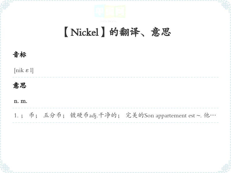 ; 币; 五分币; 镀硬币adj.干净的; 完美的Son appartement est ~. 他家干净极了。 Viens avec nous. Ce sera ~! 太好了, 和我们一起去吧!