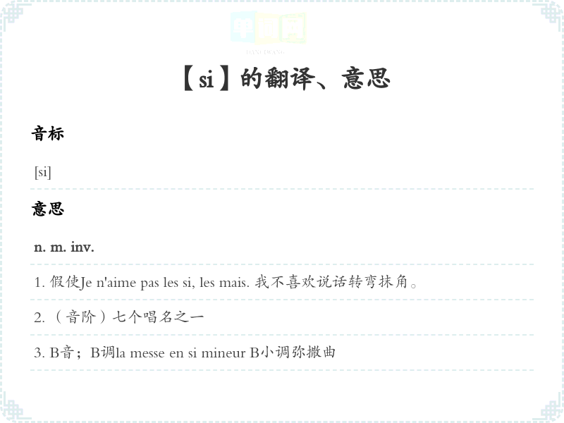 [引出带有que后果从句]si...que 这样地…以致Le vent soufflait si fort que son chapeau fut enlevé. 风刮得那么大,他帽子都给吹掉了。C [作比较副词用](跟)…同样地,(想)…那样地Rien n'est si beau qu'un coucher de soleil. 什么也没有夕阳那么美丽。si peu que 和…一样少,像…那样少D si...que... 不管怎样…,无论么…,尽管…,不管…到什么程度[后接让步从句]si petit qu'il soit 哪怕是很小,尽管很小Si intelligent qu'il soit [soit-il], il ne peut pas tout savoir. 不管他怎么聪明,他不可能什么都知道。si bien queloc. conj.以致,因此Elle n'a pas écrit, si bien que je ne sais pas à quelle heure elle arrive, 她没有写信,因此我不知道她几点到达。que siloc. conj.如果[用在演说文体中, 放在句首, 代替si]si ce n'est loc. prép.即使不是,如果不是,除了Un des meilleurs, si ce n'est le meilleur. 即使不是最好,也算得上最好之一。Il n'y a personne dans la cour, si ce n'est quelques enfants. 院子里除了几个孩子,几乎没有人。si ce n'étaitloc. prép.
