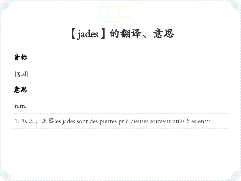【jades】 助记:、 词根:、 联想、 名词化:、 词化:、 形容词化:、 近义词、 反义词、 同音、近音词 联想词
