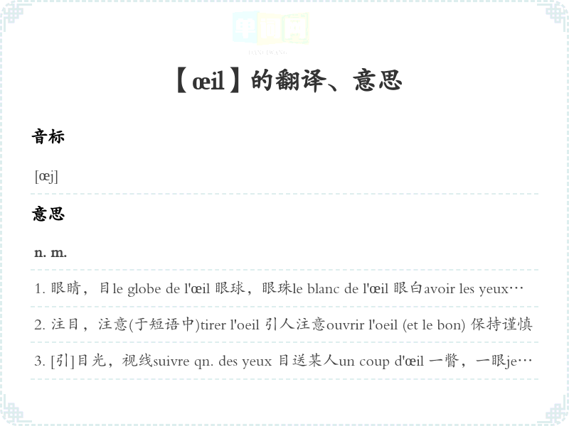 注目,注意(于短语中)tirer l'oeil 引人注意ouvrir l'oeil (et le bon) 保持谨慎