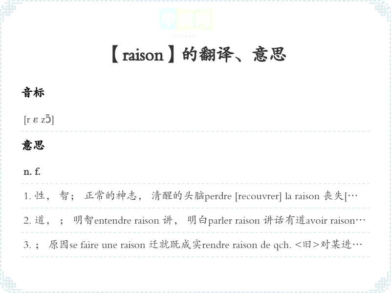 【raison】 联想:、 名词变化:、 形容词变化:、 副词变化:、 近义词:、 义词: 联想词