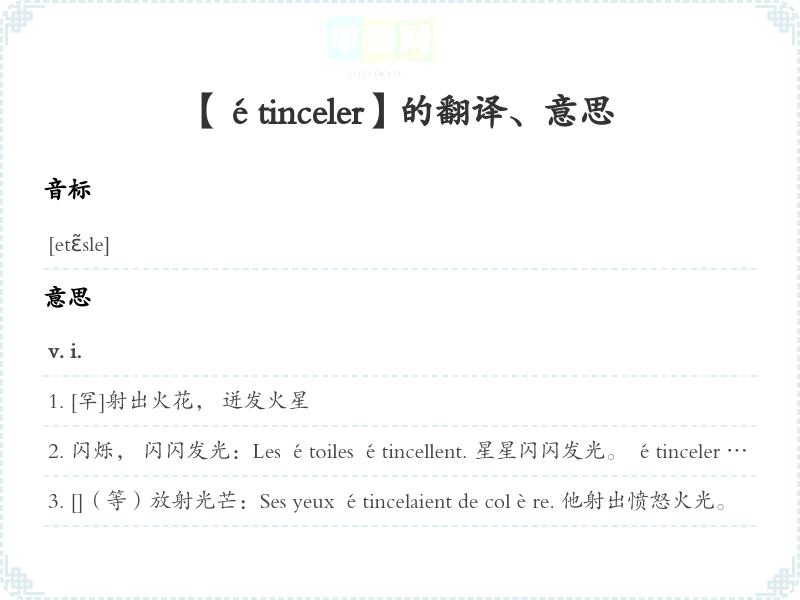 闪烁, 闪闪发光:Les étoiles étincellent. 星星闪闪发光。 étinceler de mille feux 闪耀着万道金光mer qui étincelle au clair de lune 在月光下闪烁着海面