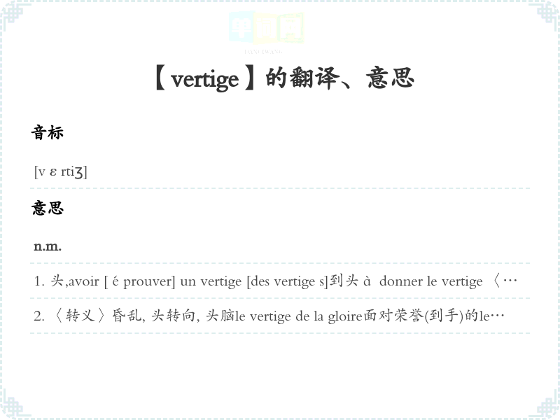 〈转义〉昏乱, 头转向, 头脑le vertige de la gloire面对荣誉(到手)的le vertige de l'ambition野心的诱惑