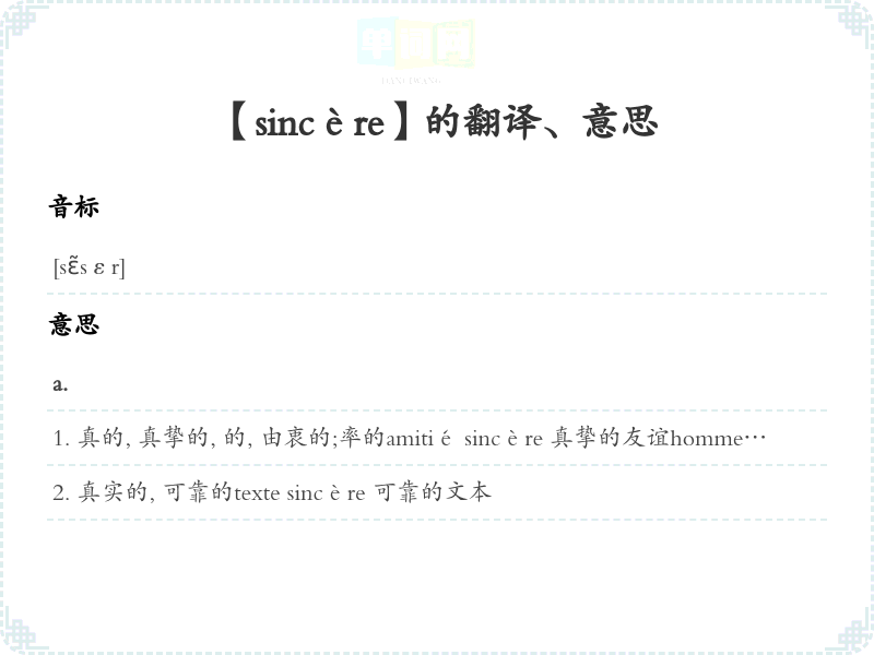 真的, 真挚的, 的, 由衷的;率的amitié sincère 真挚的友谊homme sincère 的人Recevez mes sincères salutations.请接受我衷心的问候。 [信末用语]