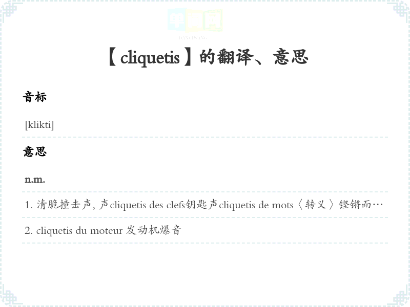 清脆撞击声, 声cliquetis des clefs钥匙声cliquetis de mots〈转义〉铿锵而空洞话