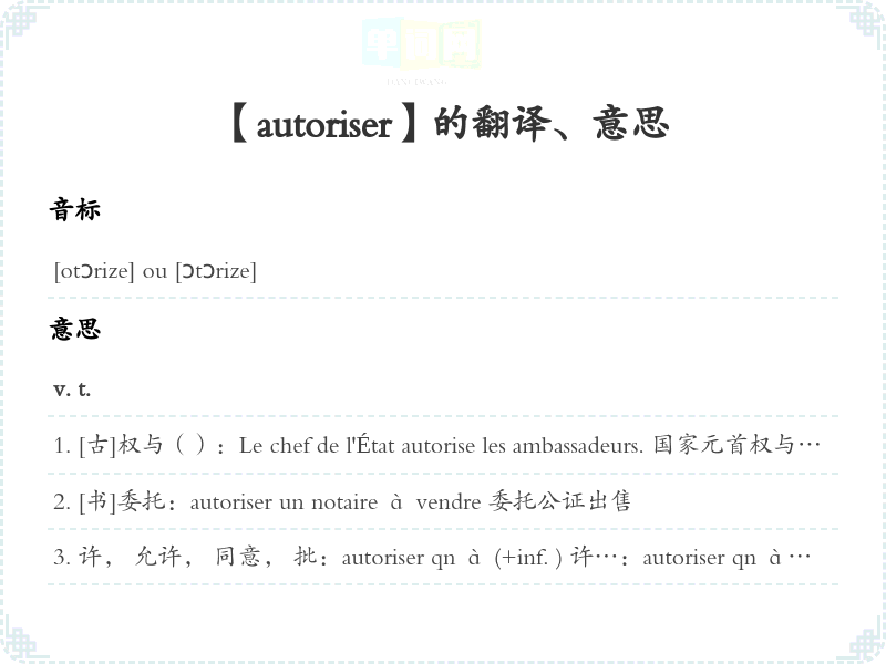 许, 允许, 同意, 批:autoriser qn à (+inf. ) 许…:autoriser qn à s'absenter 许暂时离开autoriser qch 同意事, 批事; [引]使有理由, 使有借口 autoriser les sorties 同意外出s'autoriser v. pr. (+ de)按照, 依据; 作为借口:Il s'autorise de votre exemple pour agir de la sorte. 他学你的样也这样做。