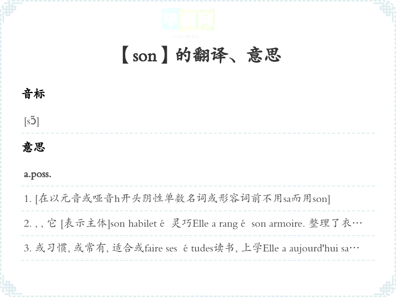 , , 它 [表示主体]son habileté 灵巧Elle a rangé son armoire. 整理了衣橱。Il a ses lunettes sur son nez. 鼻子上架着眼镜。la machine et son rendement 机器及其效率