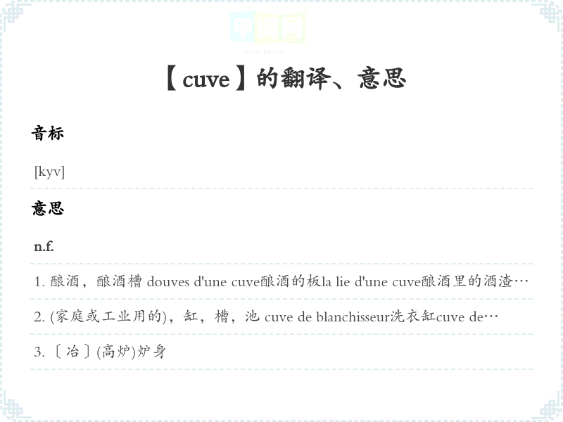 (家庭或工业用的),缸,槽,池 cuve de blanchisseur洗衣缸cuve de teinturier染缸cuve à levain发面缸cuve servant au développement des épreuves photographiques(照相)显影池cuve à mazout柴油罐cuve d'un lave-vaisselle自动洗餐具机的洗涤槽cuve de rinçage冲洗槽cuve de bain洗澡盆cuve de refroidissement冷却槽cuve électrolytique电解池cuve de mercure〔化〕水银槽