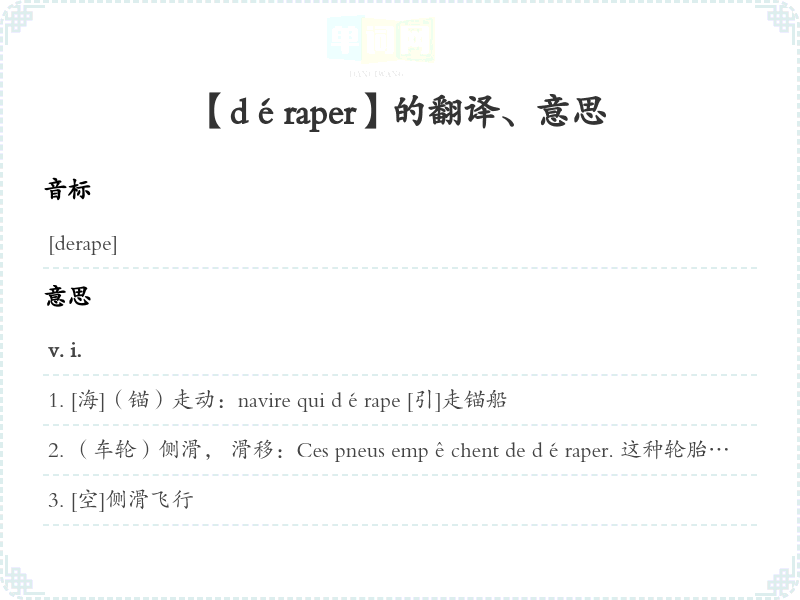 (车轮)侧滑, 滑移:Ces pneus empêchent de déraper. 这种轮胎能防滑。