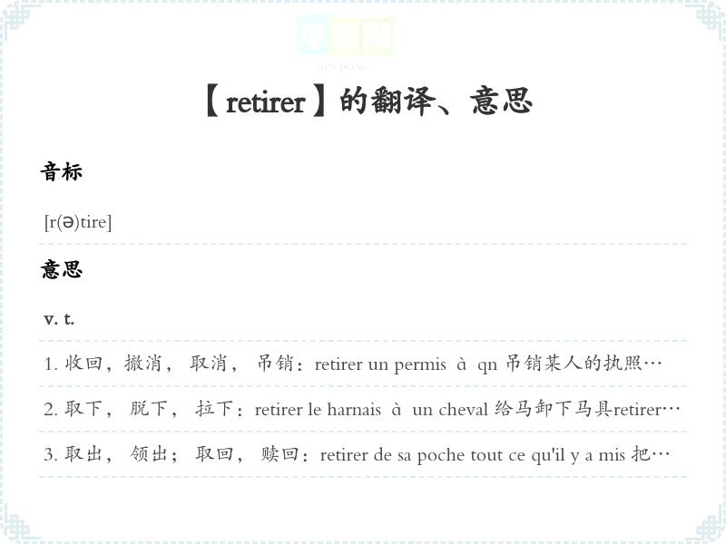 收回,撤消, 取消, 吊销:retirer un permis à qn 吊销某人的执照retirer à qn sa confiance 不再信任某人retirer sa parole 收回诺言Je retire ce que j'ai dit. 我取消我讲过的话。