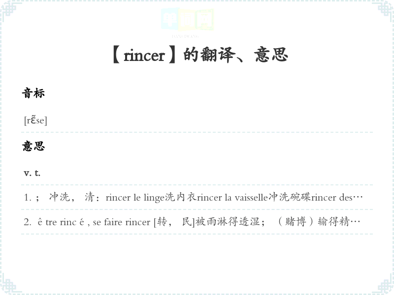 ; 冲洗, 清:rincer le linge洗内衣rincer la vaisselle冲洗碗碟rincer des bouteilles rincer le drap 清被单