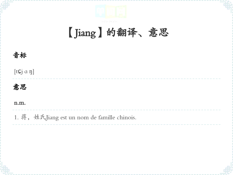 【Jiang】 助记:、 词根:、 联想、 名词化:、 词化:、 形容词化:、 近义词、 反义词、 同音、近音词 联想词