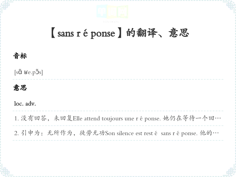 引申为:无所作为,徒劳无功Son silence est resté sans réponse. 他的沉默没有得到回应。Un appel sans réponse. 一个没有回应的呼叫。