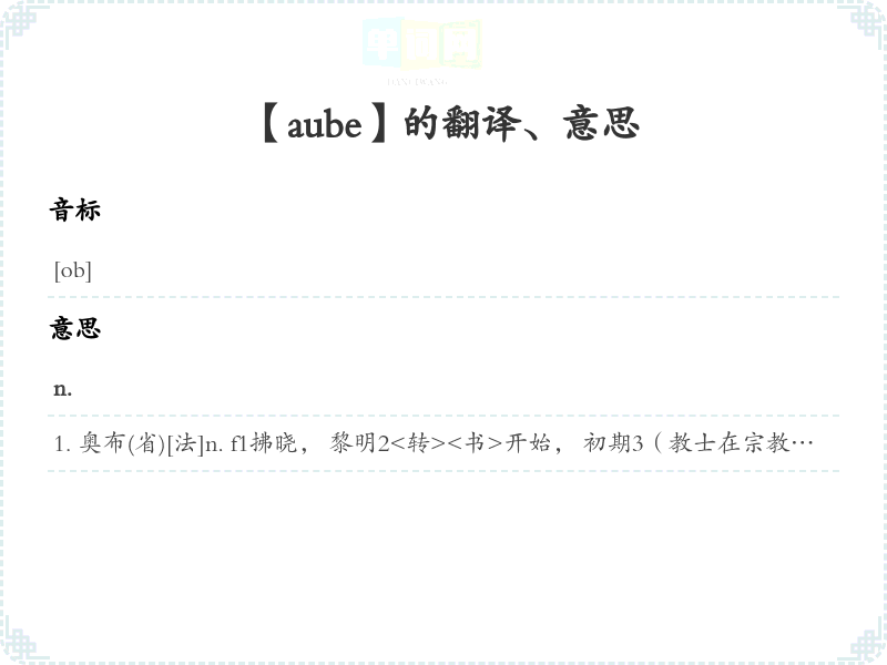奥布(省)[法]n. f1拂晓, 黎明2<转><书>开始, 初期3(教士在宗教仪式中穿的)白长衣4桨叶; [技]叶片书>转>~s de turbine 涡轮叶片