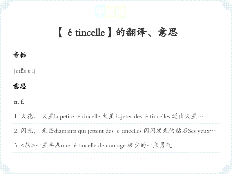 闪光, 光芒diamants qui jettent des étincelles 闪闪发光的钻石Ses yeux lancent des étincelles. 他的眼睛放射着光芒。étincelle de génie 灵机一动,天资才华的闪光