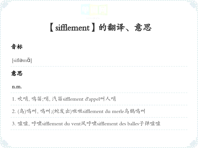 (鸟)鸣叫, 鸣叫;(蛇发出)咝咝sifflement du merle乌鸫鸣叫