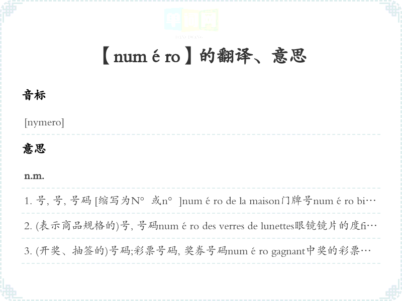 (报刊等的)期, 号;〈引申〉(报刊的)某一期le numéro d'un journal报纸期号un numéro spécial d'une revue杂志的特刊numéro extra号外Ce numéro est épuisé.这一期已售完。le dernier numéro 最近一期la suite au prochain numéro 下期续载;〈转〉〈语〉下面的事以后再讲