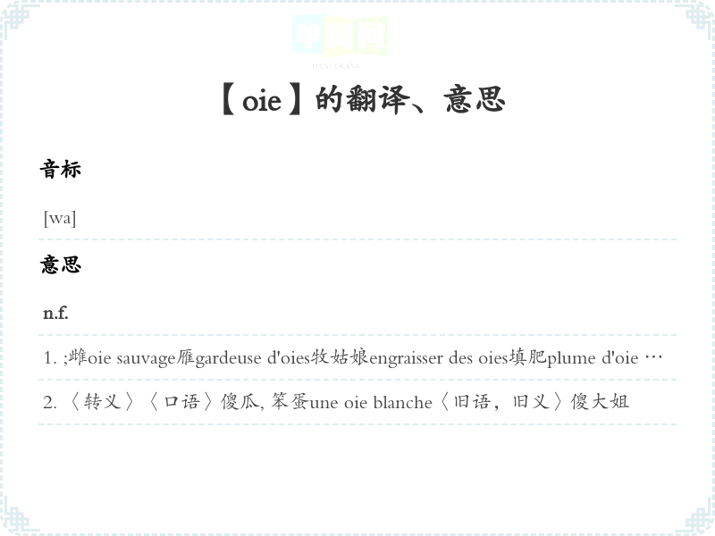 ;雌oie sauvage雁gardeuse d'oies牧姑娘engraisser des oies填肥plume d'oie 毛管;毛笔jeu de l'oie 跳游戏 [一种儿童玩棋]bête comme une oie 蠢极了