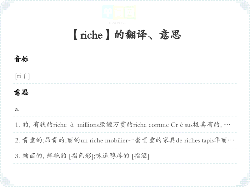 riche de 有…的, 于…的 [一般指抽象的东西]un livre riche d'enseignement很有教育意义的书— n.人, 翁, 有钱人nouveau riche 暴发户gosse de riche (s)家子, 阔少