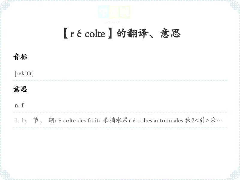【récolte】 词源:、 词根:、 联想:、 近义词:、 反义词: 联想词