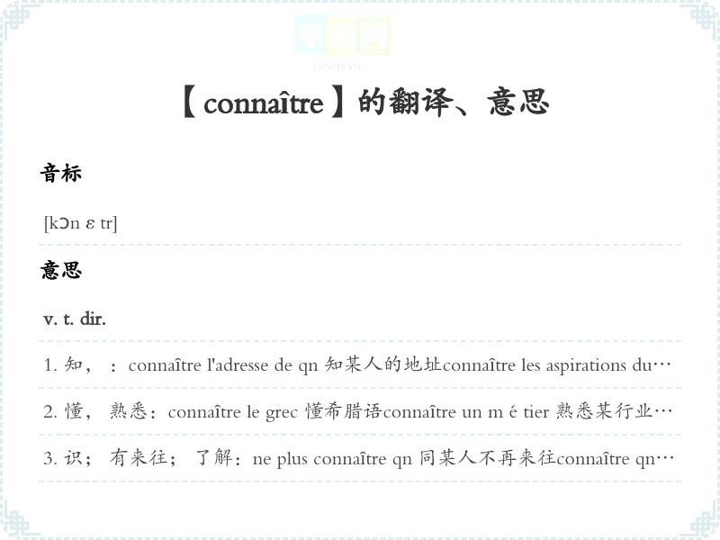 识; 有来往; 了解:ne plus connaître qn 同某人不再来往connaître qn de vue 和某人面熟se faire connaître 自我介绍; 引人注意自己; 使自己出名Je ne connais pas cet auteur. 我不知这个作家。 我没听说这个作家。 Je ne le connais ni d'Eve ni d'Adam. [俗]我根本不他。