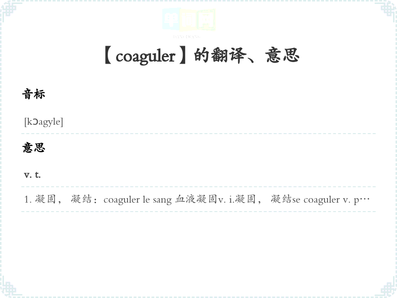 凝固, 凝结:coaguler le sang 血液凝固v. i.凝固, 凝结se coaguler v. pr.凝固, 凝结:Le lait se coagule. 牛奶会凝结。v. t.凝固, 凝结v. i. , se ~ v. pr.凝固, 凝结