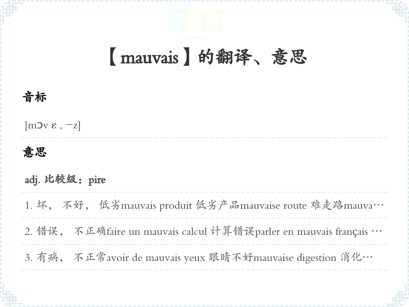 坏, 不好, 低劣mauvais produit 低劣产品mauvaise route 难走路mauvaise qualité 劣质une mauvaise mémoire 坏记性