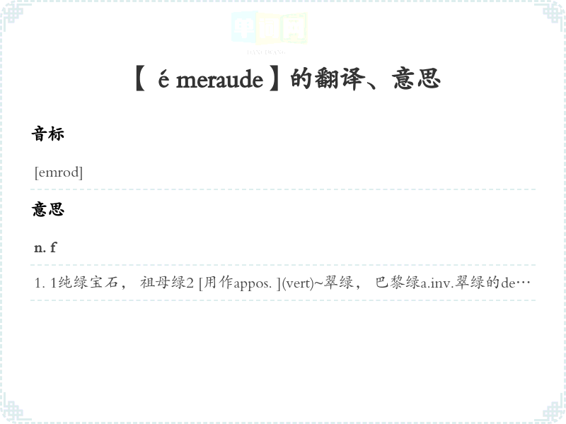 1纯绿宝石, 祖母绿2 [用作appos. ](vert)~翠绿, 巴黎绿a.inv.翠绿的des rubans émeraude dans les cheveux 扎在头上的翠绿色发带