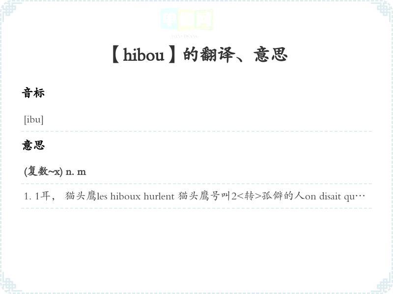 1耳, 猫头鹰les hiboux hurlent 猫头鹰号叫2<转>孤僻的人on disait que son oncle était un vieux hibou 人家说他的叔父是一个孤僻的老头转>