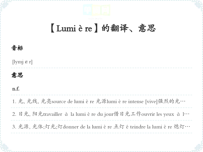 〈转义〉阐述, 说明;明, 然, 众所周知L'auteur jette une lumière nouvelle sur la question.作者对问题作了新的阐述。mettre en (pleine) lumière 明;揭示;阐明;揭露faire [jeter de] la lumière sur une affaire弄明白一件事, 使一事真相大白mettre la lumière sous le boisseau掩盖真相à la lumière de在…启示下, 根据