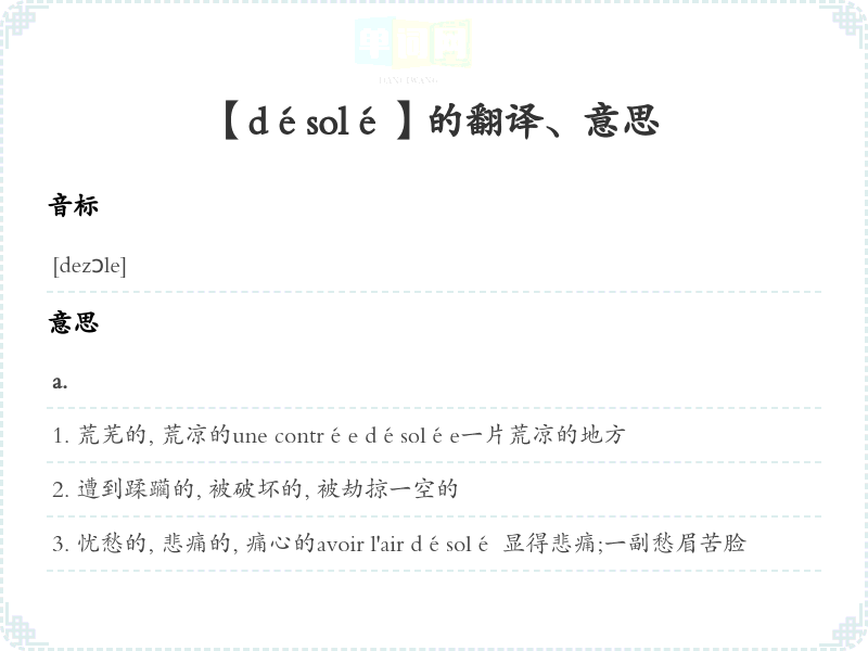 忧愁的, 悲痛的, 痛心的avoir l'air désolé 显得悲痛;一副愁眉苦脸