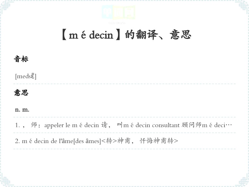, 师:appeler le médecin 请, 叫médecin consultant 顾问师médecin légiste 法médecin militaire军médecin spécialiste 专科médecin généraliste 全科consulter le médecin 看病, 就诊