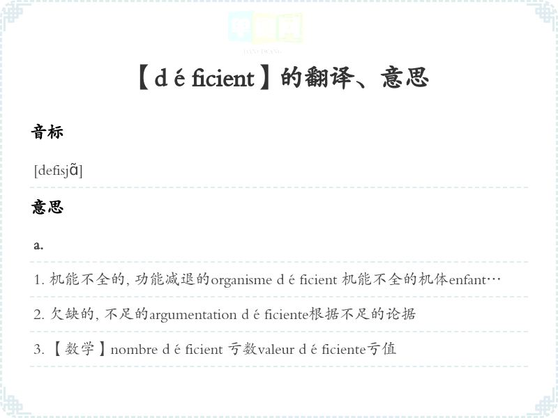 机能不全的, 功能减退的organisme déficient 机能不全的机体enfant déficient 智发育不全的孩子