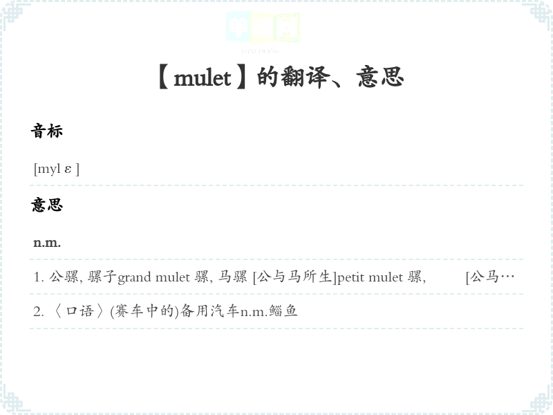 公骡, 骡子grand mulet 骡, 马骡 [公与马所生]petit mulet 骡, [公马与所生]chargé comme un mulet 〈口语〉像骡子一样扛着很重的东西